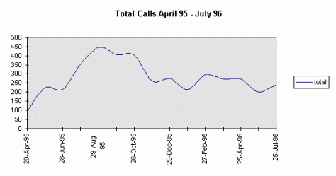 The following graph shows the number of calls for the period from April 1995 to July 1996. The graph shows that the average number of calls per month ranged from a peak of 450 to a low of 200, with an average around 300. For most months, the rate was within the band of 250-300. About 30 calls per month could be discounted as technical checks or routine calls to establish connection.