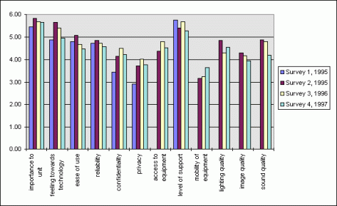 Table 9, following, provides a composite summary of staff attitudes to a number of factors, across four surveys: two in 1995 and one each in 1996 and 1997. The results show no statistical variation of any note, suggesting that telemedicine was implemented with adequate care in 1994-95 and that many of the problems associated with telemedicine such as the imperfect quality of the video and audio and the challenges of providing adequate privacy and confidentiality in an open dialysis ward are difficult to resolve.